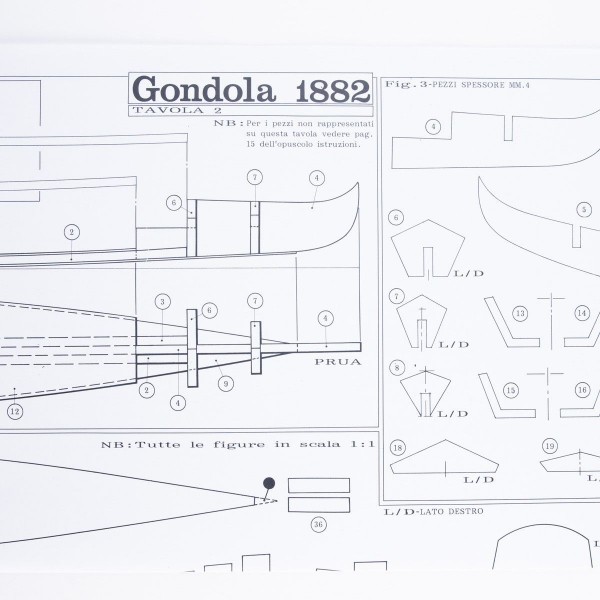 Plano de montaje Gondola Veneciana.Escala 1 a 20, longitud total 27cm.